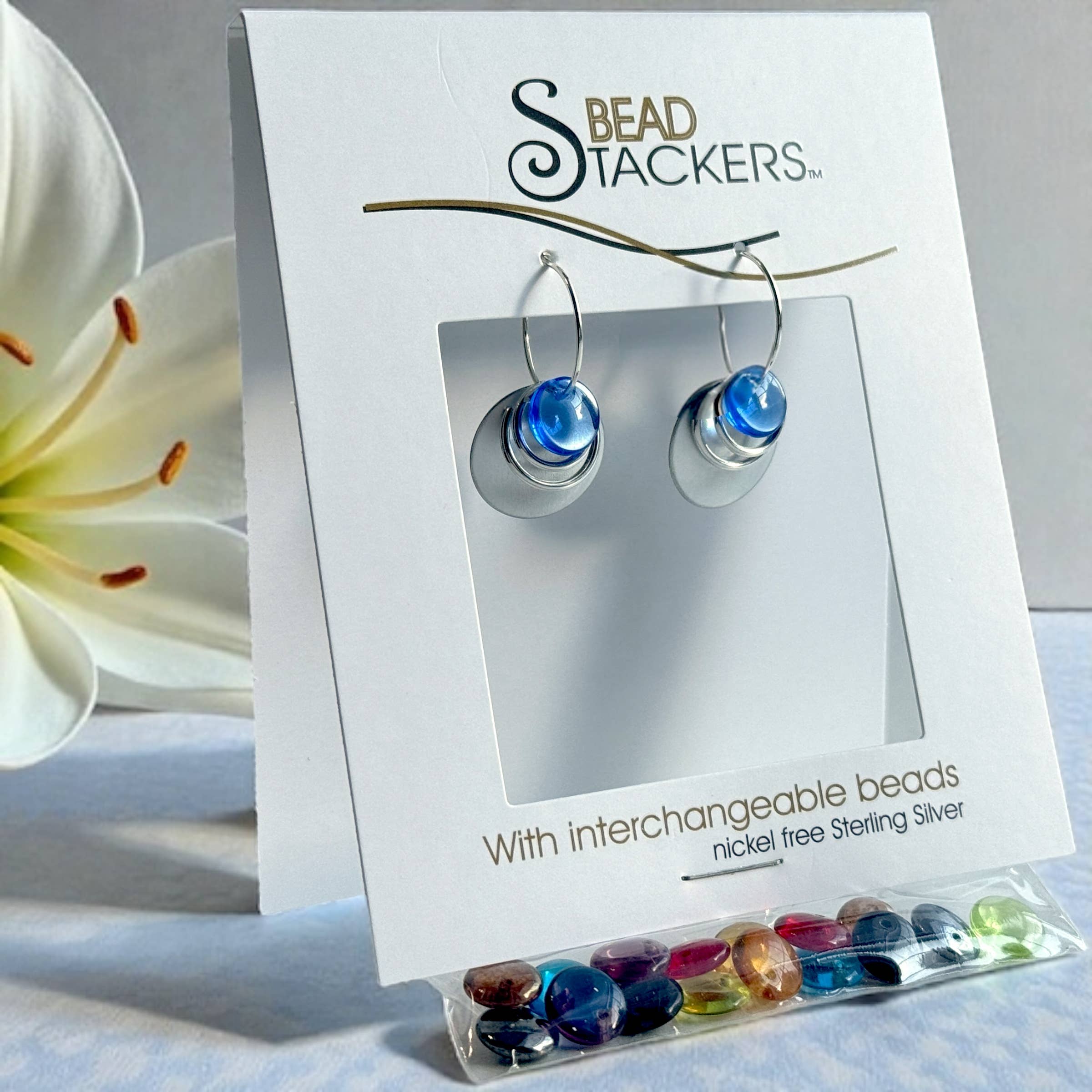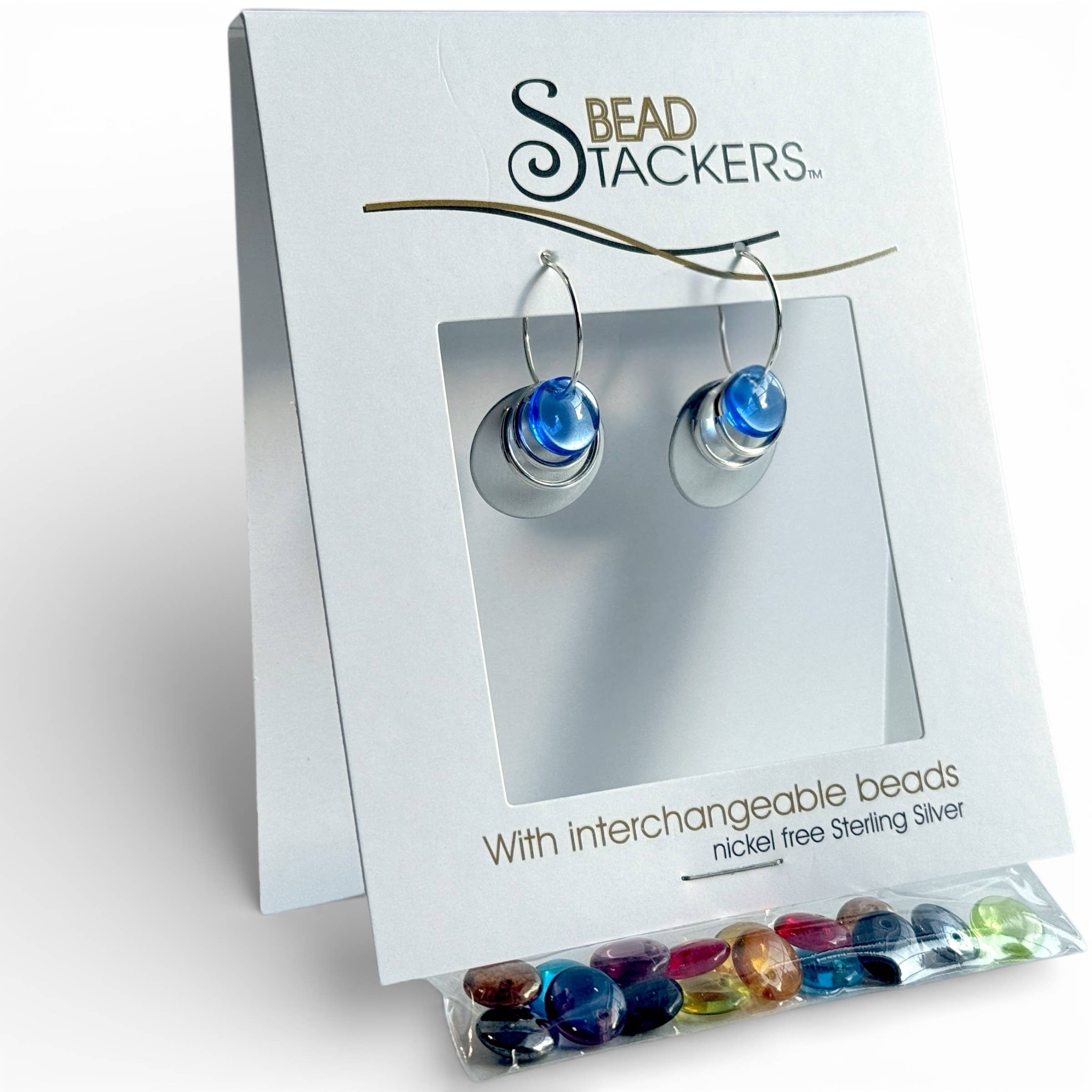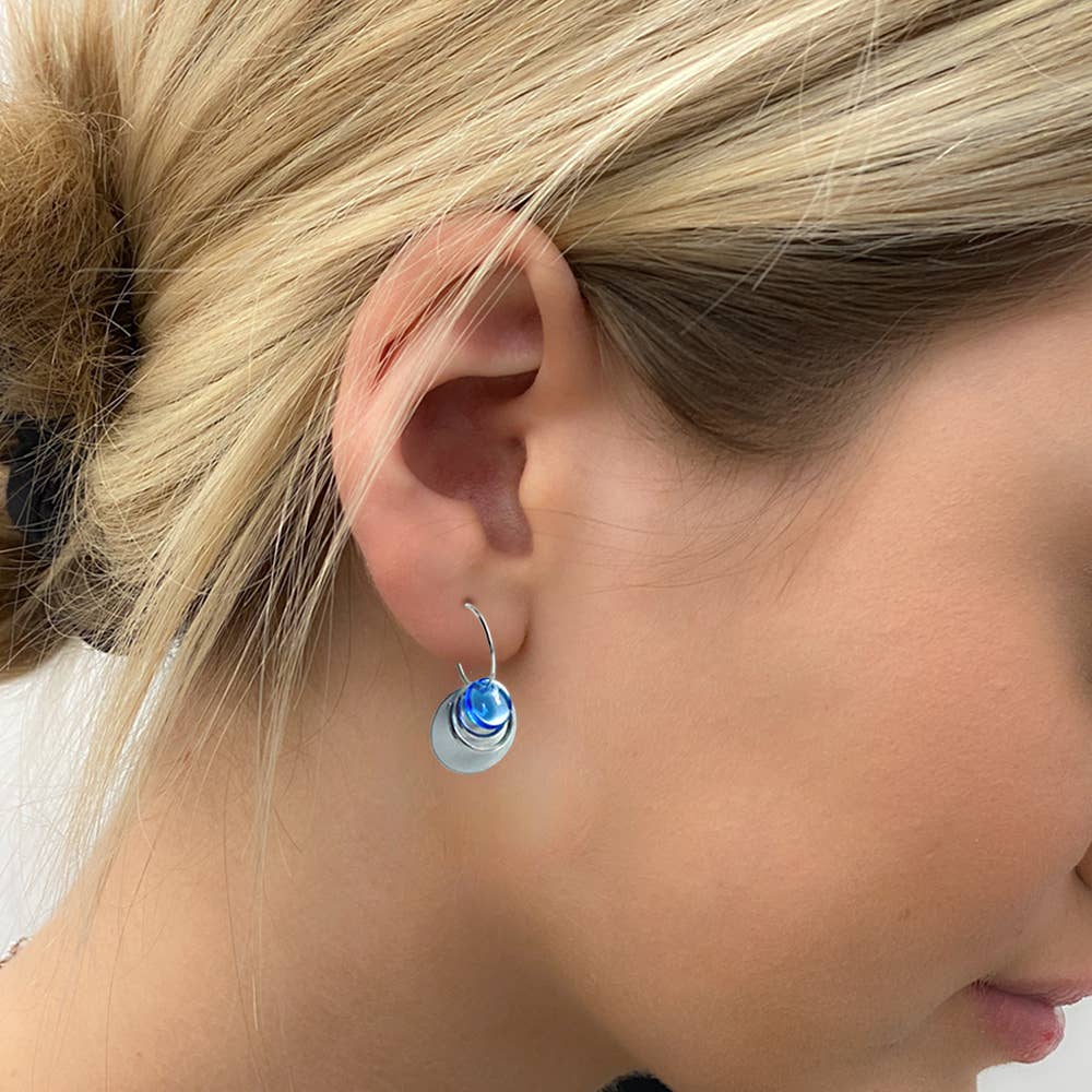 Each pair comes with 9 interchangeable colours. The interchangeable glass beads are European made. No need for rubber backs. Pin like closure keeps earrings secure on ears. Wires are designed using North American made nickel-free Sterling Silver. 9 colours, 1 1/4” Length. Earrings are tariff free and USMCA compliant.