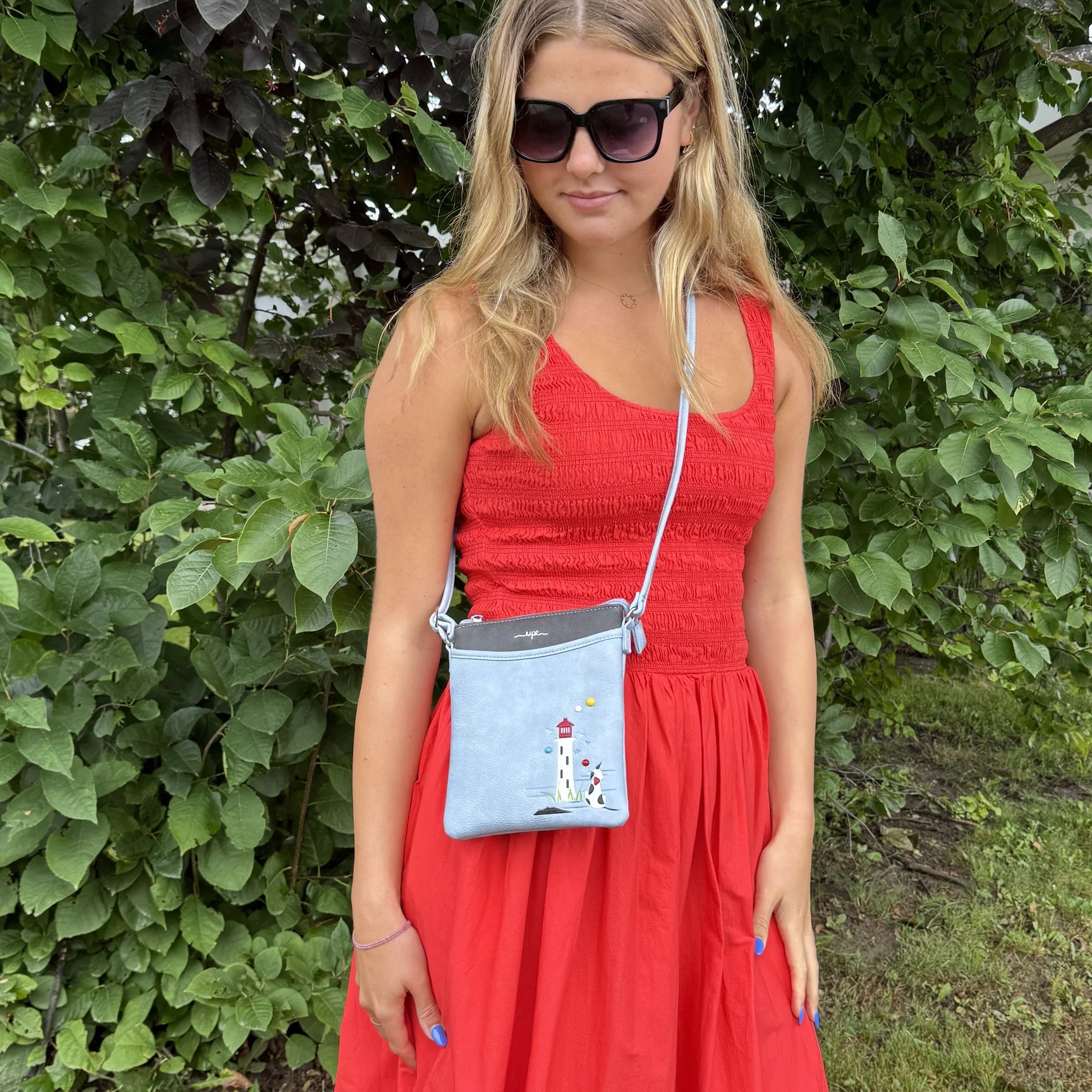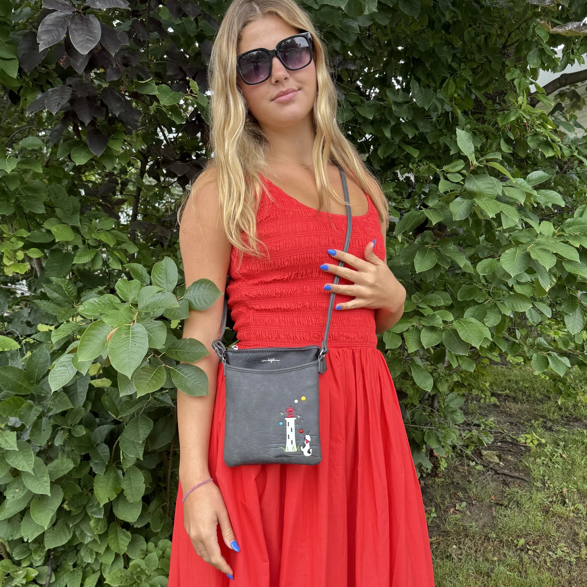 This perfectly sized mini crossbody bag is adorned with an adorable puppy sitting beside an iconic lighthouse — a fun and whimsical design that brightens every outing. Compact yet functional, it’s the ideal bag for carrying your essentials. The adjustable strap features cute knot details and can be easily lengthened or shortened by simply retying the knots. Lightweight, stylish, and cruelty-free, it’s the perfect vegan leather mini crossbody for everyday adventures.