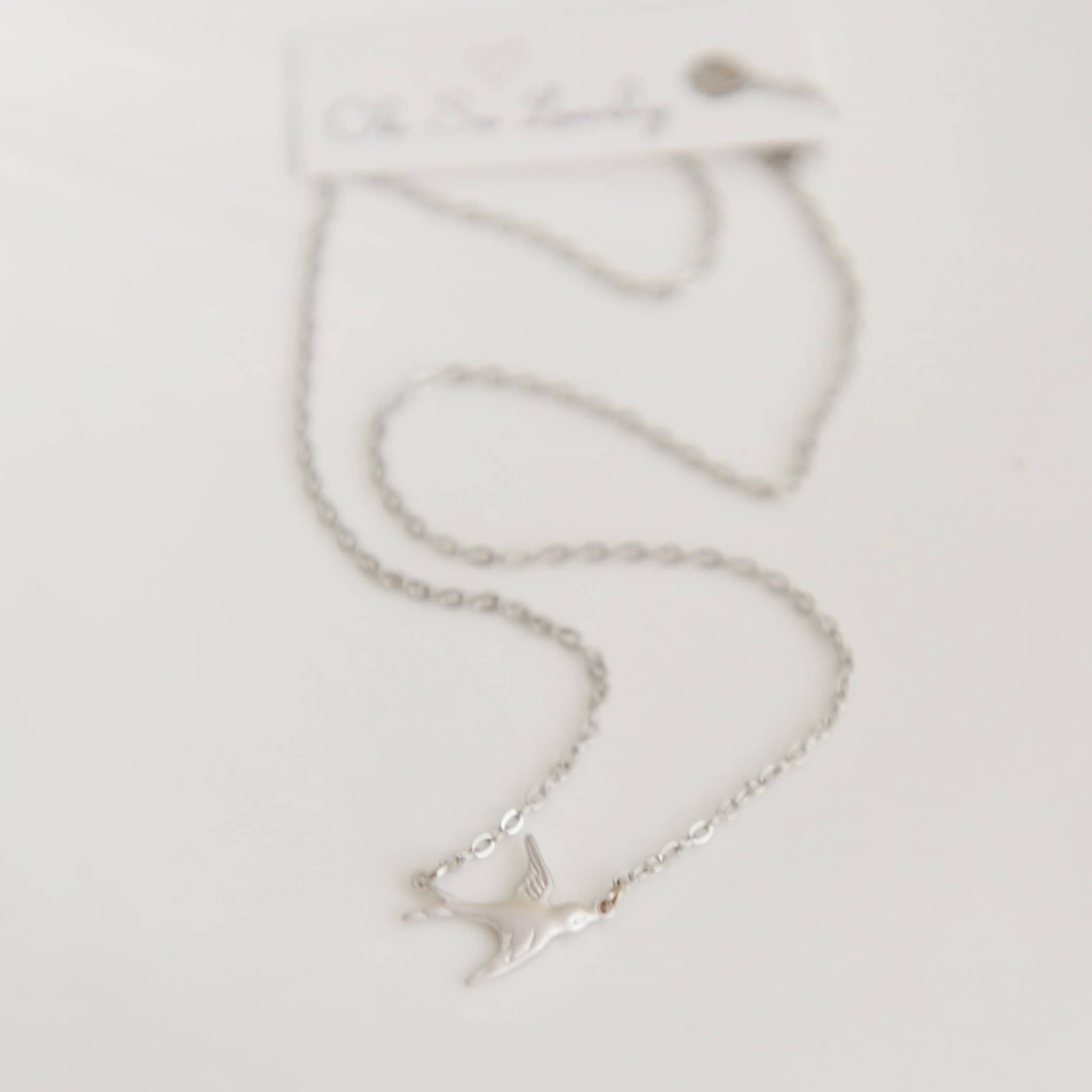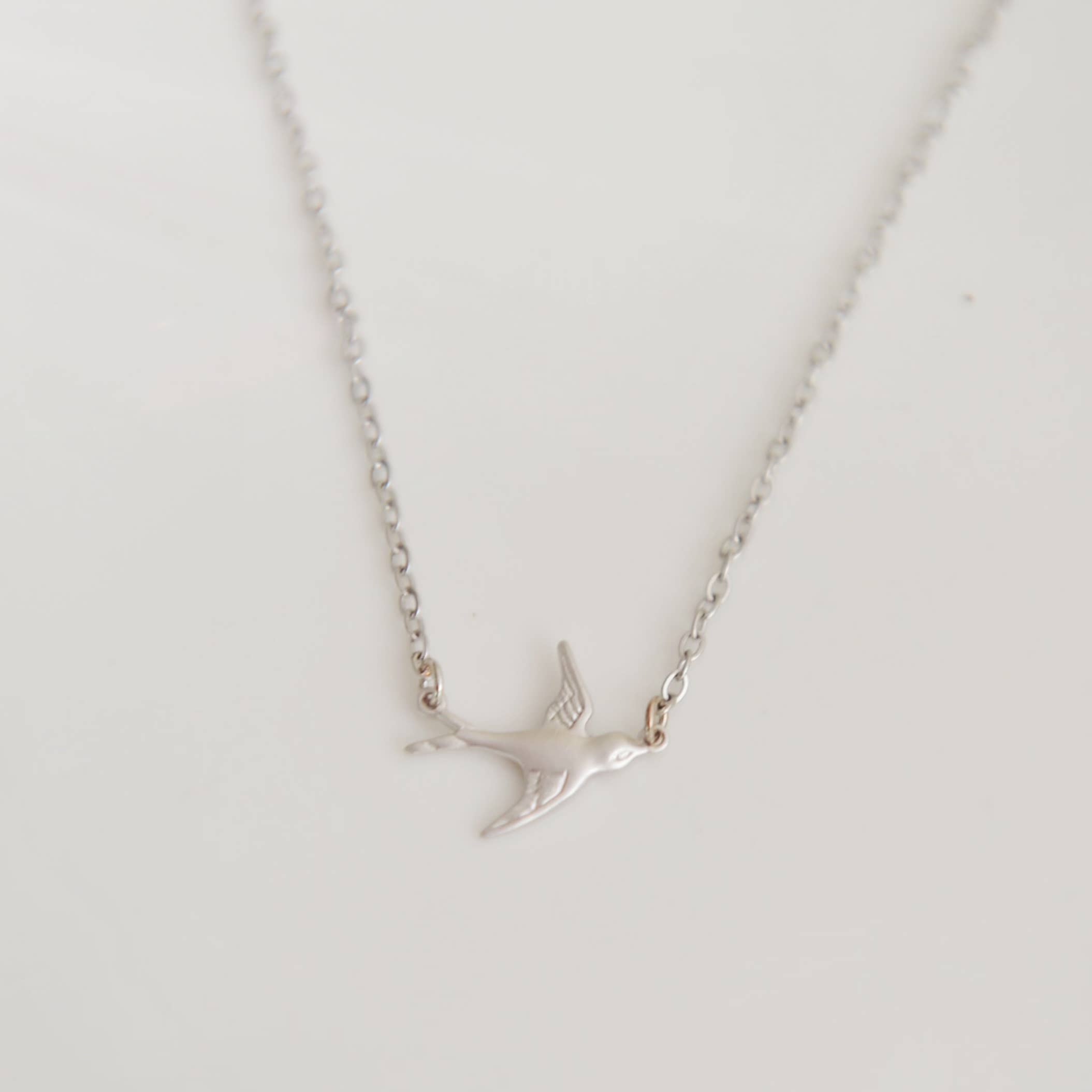 Sweet Swallow Bird charm made from Matt Rhodium plated brass upon 18" chain. 18” Stainless Steel chain Charm: 14.5 x 16.5mm