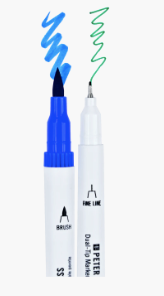 - Each marker has 2 tips: Fine (0.4 mm) for detail work, and Brush for broad area coverage.