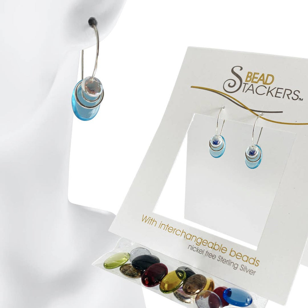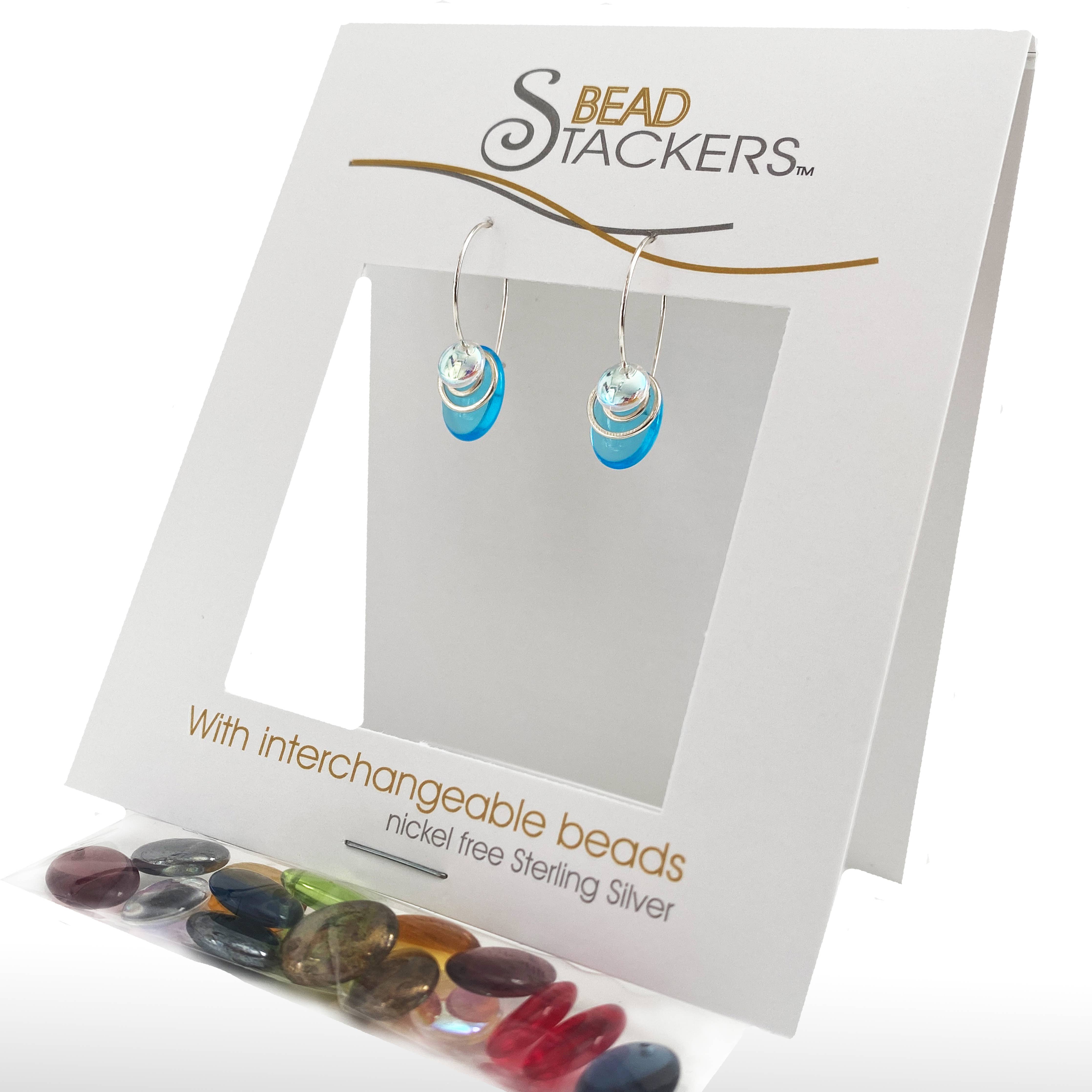 Earrings come with 9 interchangeable colours. The beads are European made glass. This petite design is great for women of all ages. Pin like closure keeps earrings secure on ear. Wires are designed using nickel free Sterling Silver.