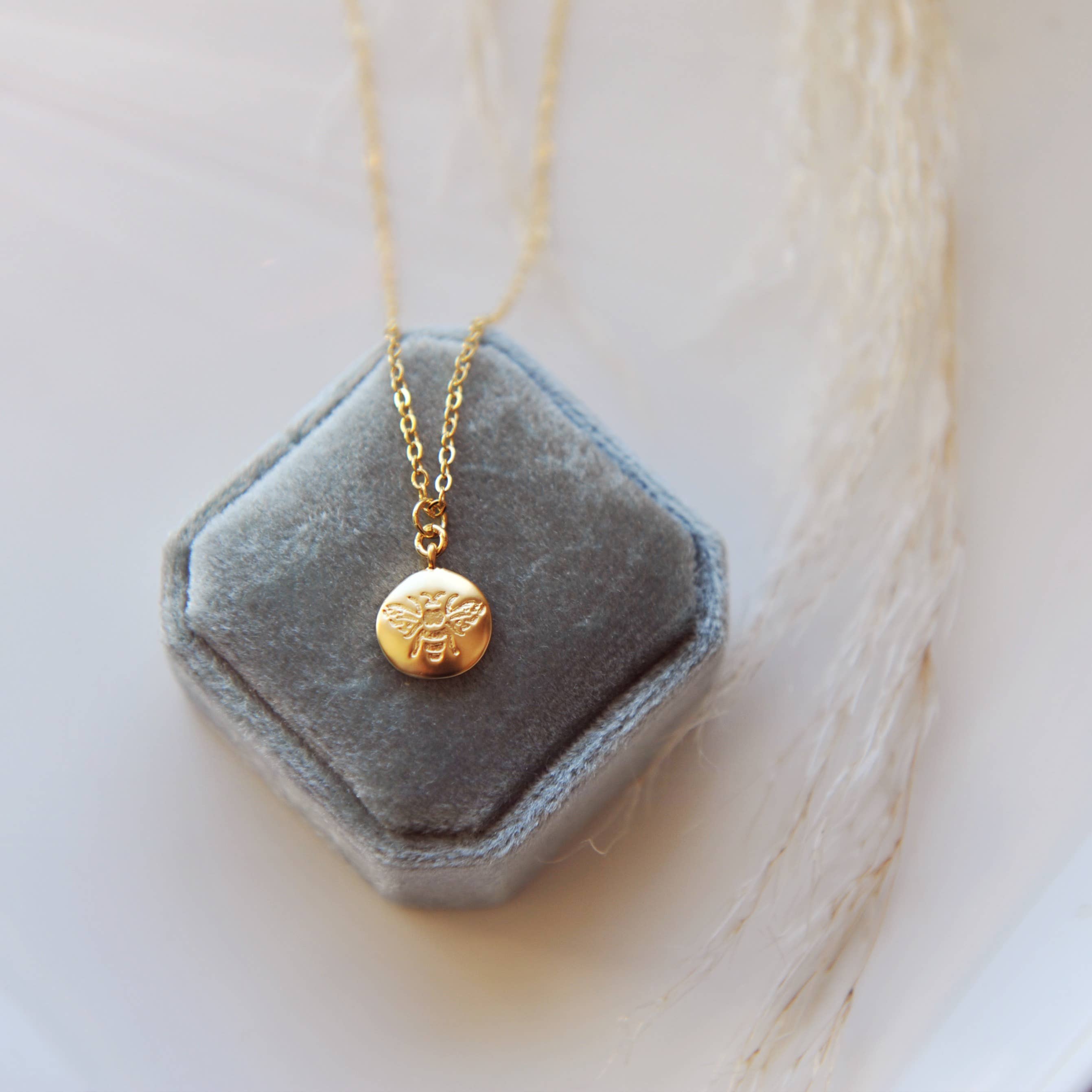Calling all bee lovers - this dainty bee necklace is for you! Charm: 10mm Material: Gold plated brass 18” 16k gold plated chain