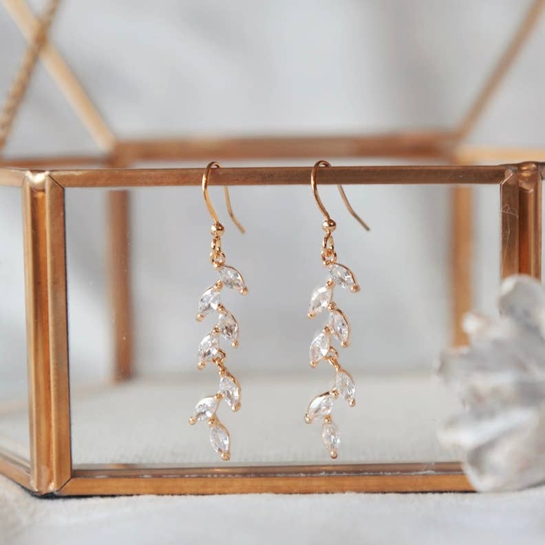 Stunning crystal vine earrings with all the sparkle. Gold plated hooks Material: Gold plated over brass, cubic zirconia Pendant Size: 35mm