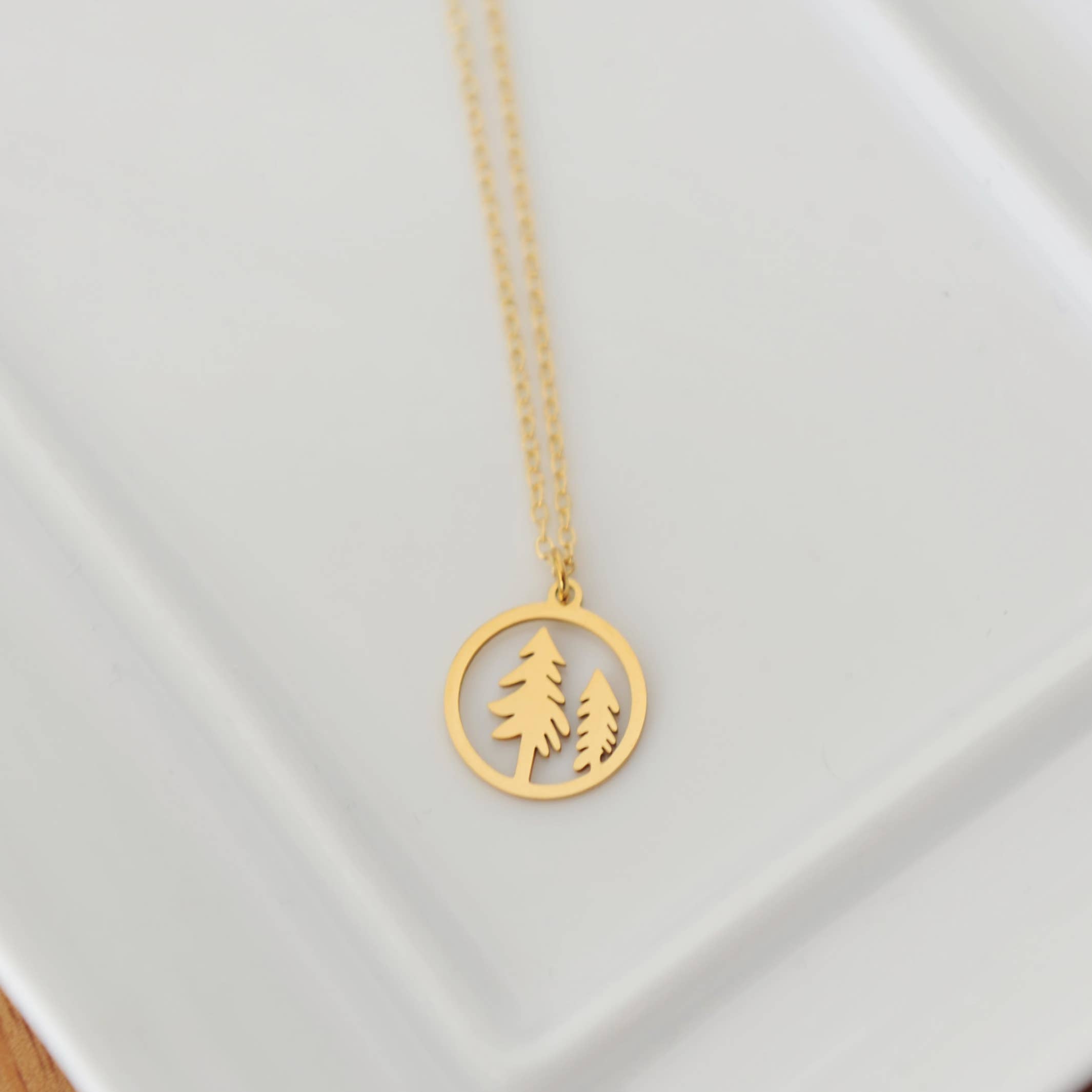 Stainless steel tree charm upon 18” 16k gold plated brass chain or stainless steel chain. Charm: 15 x 17mm