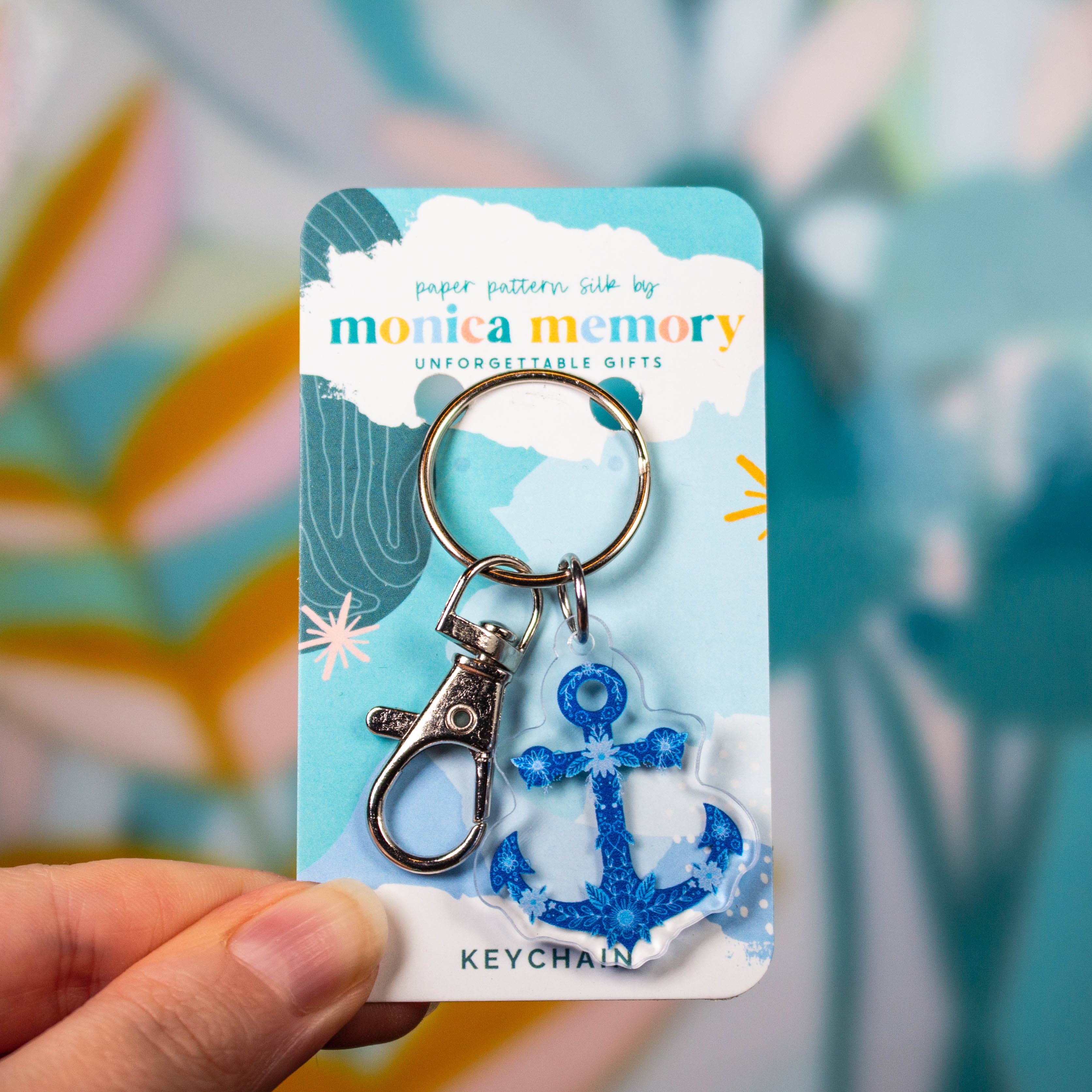 Blue Floral Anchor Keychain - Nautical Gift Keyring