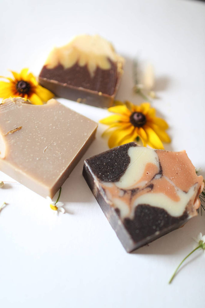 This soap bar design was inspired by the beautiful sunflower, in full bloom late summer through to fall. We’ve incorporated cocoa powder to get a rich dark brown then created a beautiful shade of golden yellows with pumpkin powder.